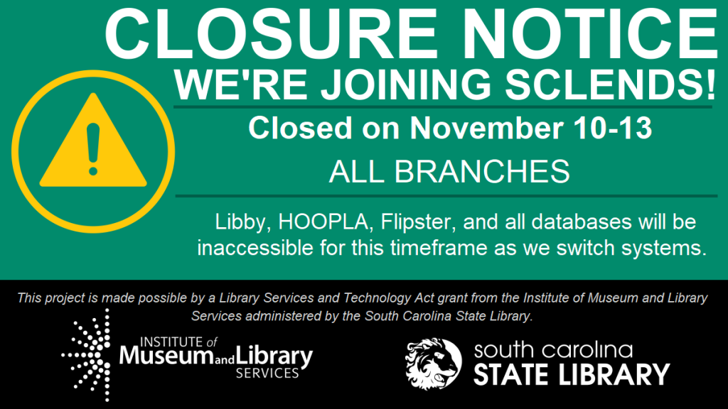 Brace yourself! From November 10 – 13, all branches of the Greenwood County Library System will be closed and your access to the catalog, your library account, and digitial materials will be unavailable during most of this time. We understand that this may be frustrating for you, and honestly, it will be for us too.